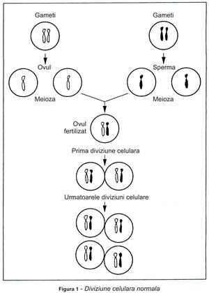 În momentul conceperii celulele ou de la mamă și celulele din spermă de la tată, care se numesc gameți, se unesc creând un ou fertilizat care este format dintr-un grup de 46 de cromozomi, divizați în 23 de perechi. În fiecare pereche un cromozom provine de la mamă și unul de la tată. În timpul maturizării celulei are loc un proces care se numește meioză sau diviziune meiotică. Oul ferilizat se împarte în două jumătăți dublând materialul genetic, în așa fel că fiecare nouă celulă se împarte în două, apoi în patru, apoi în opt și tot așa. Fiecare nouă celulă conține aceeași informație genetică ca și celula originală. (Figura 1)