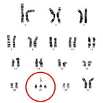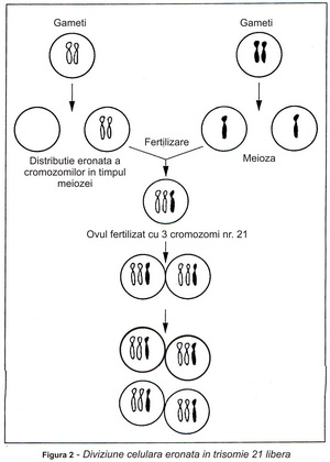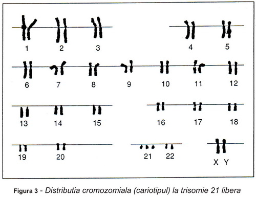 Daca cromozomul în plus apare în perechea 21, diagnosticul este de sindrom Down. Este vorba despre anomaia cea mai comună, o anomalie care permite embrionului să se dezvolte, chiar dacă aproximativ 2/3 din feții cu sindrom Down sunt avortați spontan. Se numește trisomia 21, deoarece – asa cum am mai spus – apar trei cromozomi în perechea 21 în loc de doi și deci numarul cromozomilor în fiecare celula este 47 în loc de 46. Nu știm încă de ce asta se întamplă, adică de ce în momentul diviziunii celulare cromozomii râman lipiți în loc să se separe cum este normal. (Figura 2)