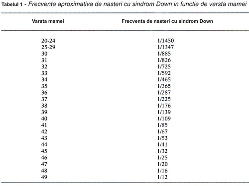 De ce se naște un copil cu sindrom Down? Sindromul Down este legat de o anomalie cromozomică; ce poate fi indentificată prin studierea cariotipului, dar nu se cunoaște cauza. Se știe doar că vârsta mamei poate fi unul dintre factorii determinanți, în sensul că probabilitatea de a avea un copil cu sindrom Down crește în funcție de vârsta mamei. (Tabelul 1)